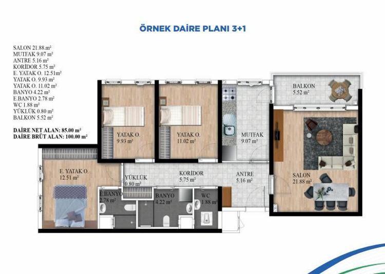 Buyrunuz kullanışlı bir 3+1 daire şemasına (resmin üzerine tıklayarak planı büyütebilirsiniz)